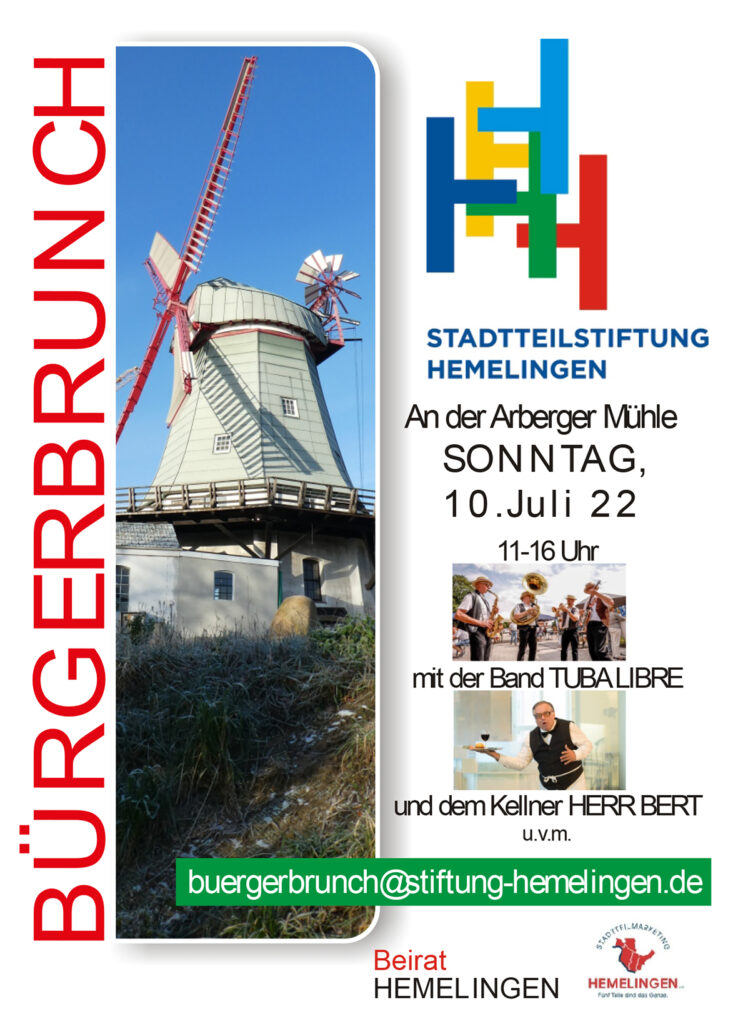 Ab sofort könnt ihr euch für den Bürgerbrunch der Stadtteil-Stiftung Hemelingen anmelden. In diesem Jahr findet der Bürgerbrunch der Stadtteil-Stiftung Hemelingen auf dem Platz zwischen Arberger Mühle und dem Stiftungsdorf Arberger Mühle statt. Am 10. Juli 2022 möchten wir ab 11 Uhr gemeinsam brunchen. Jeder gestaltet seinen Tisch selbst und packt in seinen Frühstückskorb, was ihm schmeckt. Es gibt ein Programm in Kooperation mit Bremer Heimstiftung, dem Förderverein und dem Eigentümer der Arberger Mühle.